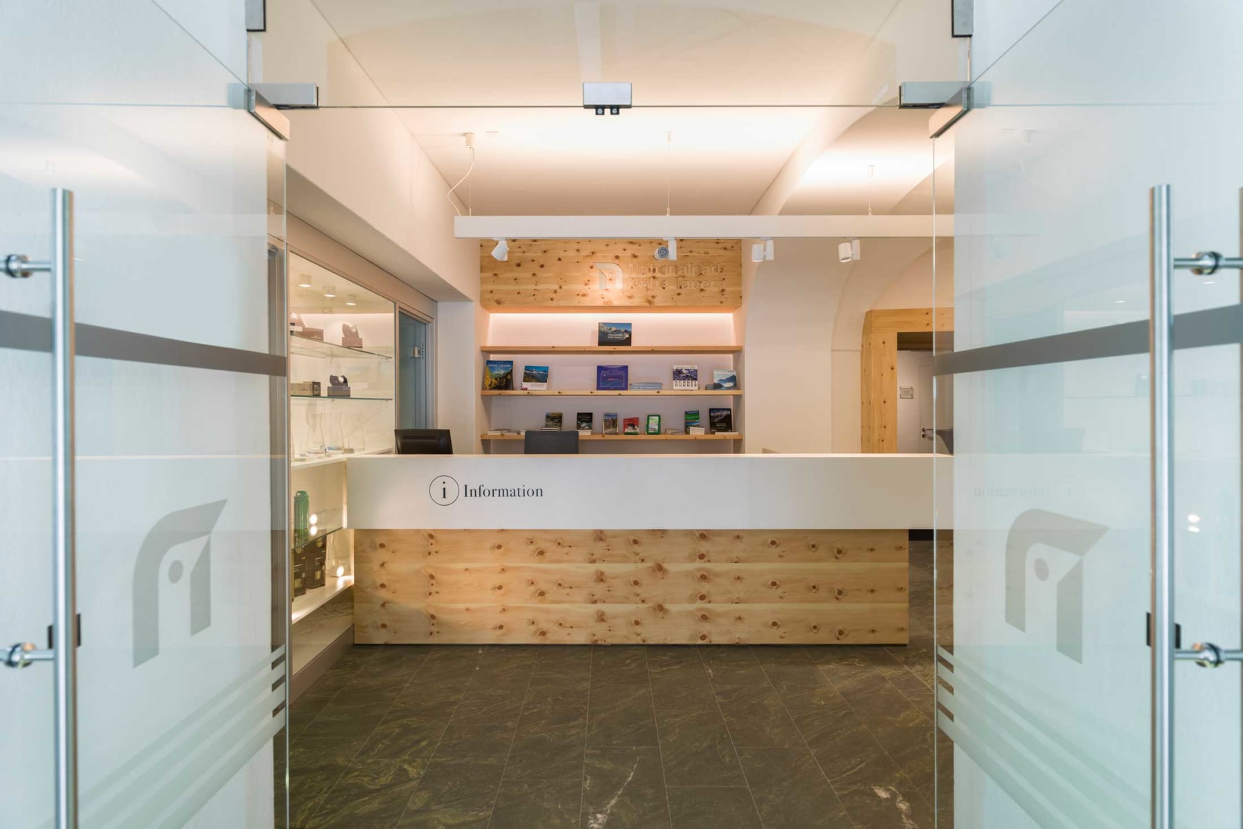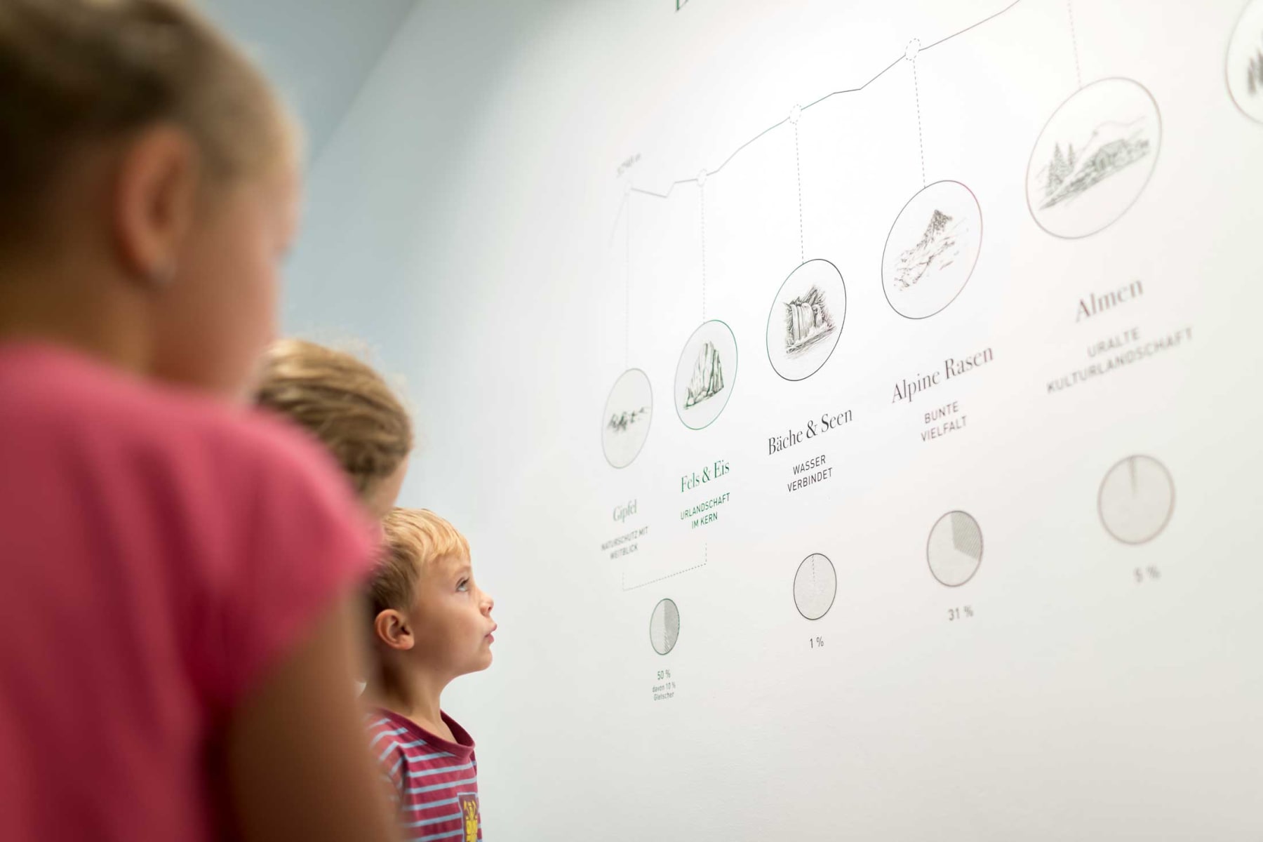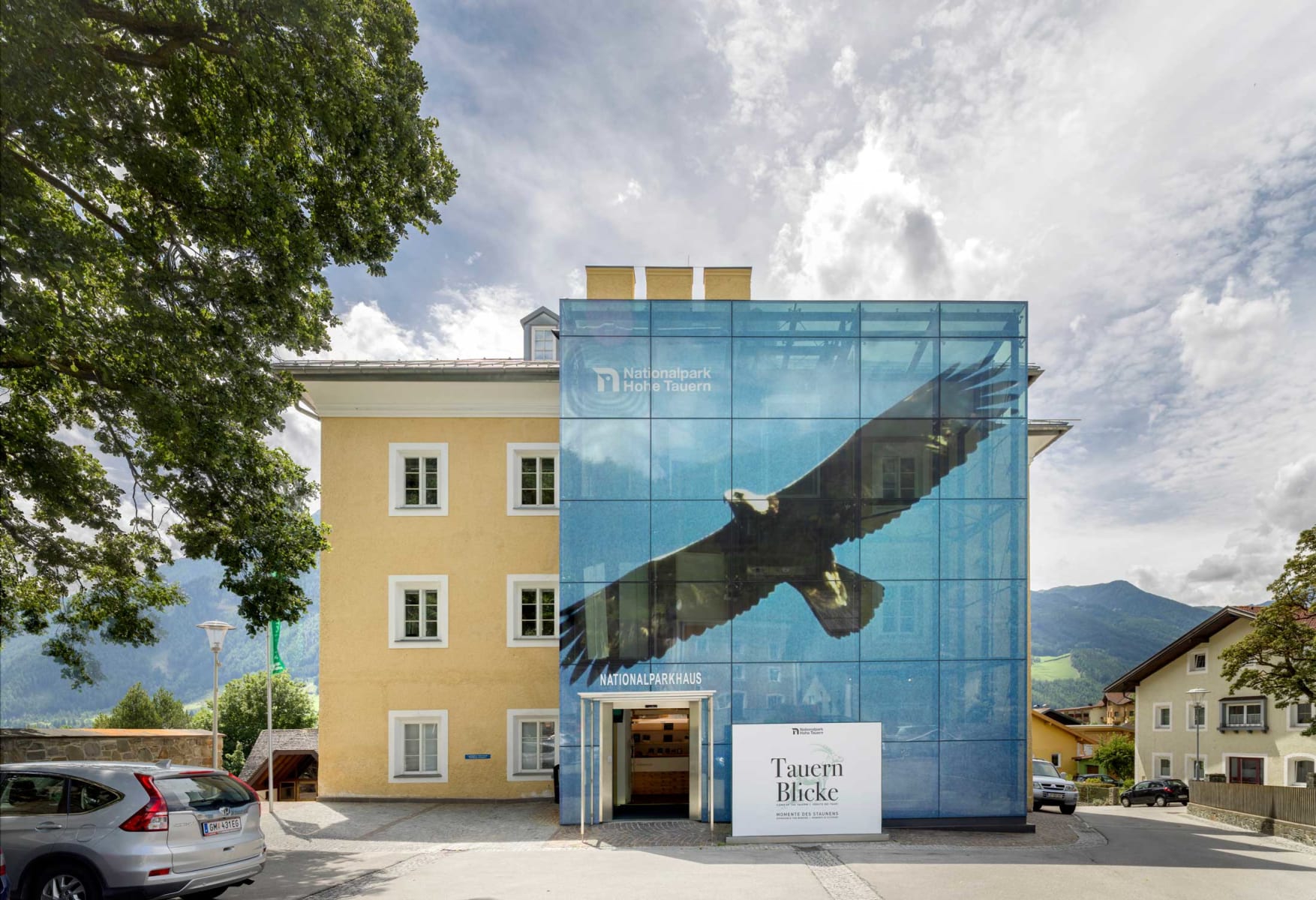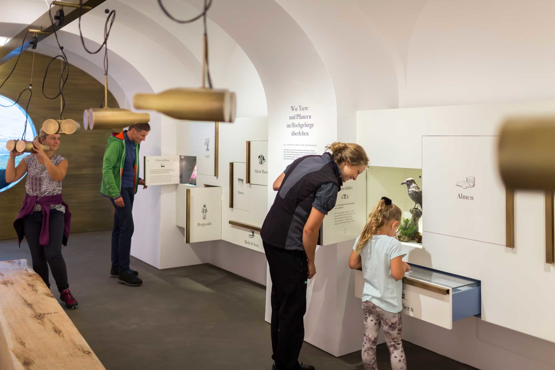 Den größten Nationalpark Österreichs in einem Keller und einem Teil des Erdgeschosses zu präsentieren – dies ist die Anforderung an die Neugestaltung der Dauerausstellung im Nationalparkhaus Hohe Tauern in Matrei i.O. Die ersten Überlegungen ergaben, dass es unmöglich ist ein so wichtiges Schutzgebiet auf solch „kleinem“ Raum umfassend zu präsentieren. Daher entscheiden wir uns aus der Ferne einen Blick in diesen zu ermöglichen und Sehnsucht zu wecken. Um ein angenehmes Ambiente zu schaffen, wird das alte, dunkle Erscheinungsbild der alten Ausstellung in ein angenehmes, helles verändert. Weiters brechen wir einen Teil der Decke zwischen EG und UG durch, um einen Luftraum zu schaffen. Die Wände sind bewusst weiß und in der Grafik schlicht gehalten, da die Einblicke in den Park dadurch umso mehr an Stärke gewinnen. Die gesamten Teilbereiche der Ausstellung befassen sich stets mit den 6 Erlebnisräumen: Gipfel, Fels & Eis, Bäche & Seen, Alpine Rasen, Almen und Bergwald. In den verschiedenen Stationen werden die Inhalte aus verschiedenen Blickwinkeln und mit verschiedenen Mitteln betrachtet. Mit modernster Technik wie VR Brillen, Hologrammprojektionen und direkten Projektionen werden Illusionen geschaffen.