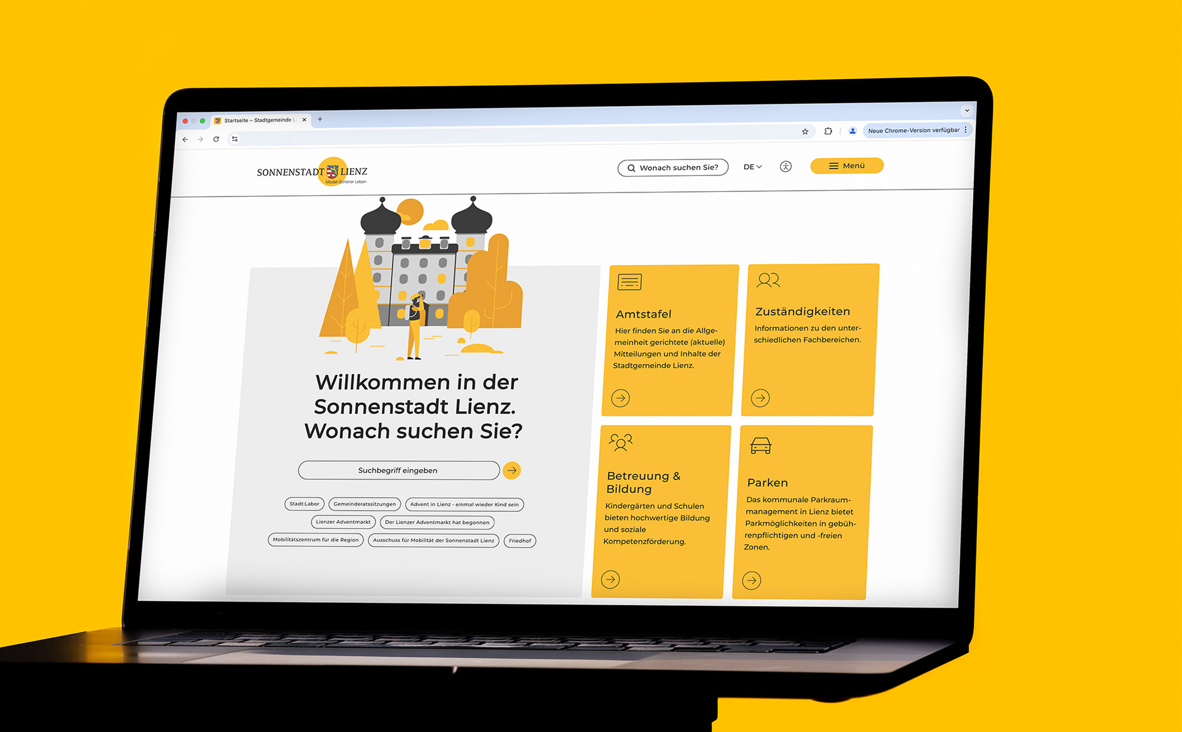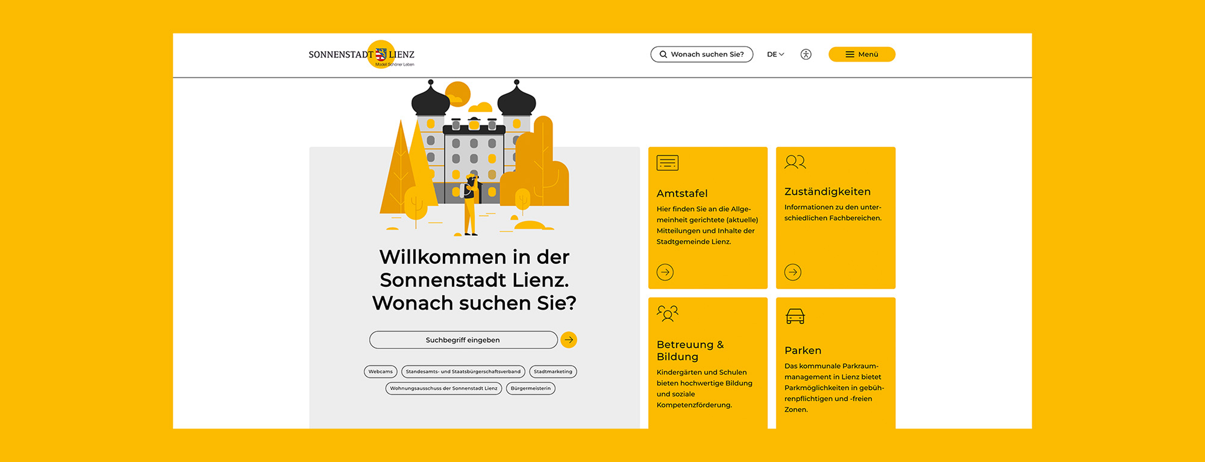 Die neue Website der Stadt Lienz überzeugt durch eine moderne, klar strukturierte Gestaltung, die gezielt auf Nutzerfreundlichkeit und visuelle Orientierung ausgerichtet ist. Ein zentrales Element des Designs ist ein individuell entwickeltes Illustrationskonzept, das sich konsequent an den CI-Farben der Stadt orientiert. Diese Illustrationen schaffen einen eigenständigen, wiedererkennbaren Look und begleiten die Nutzer:innen thematisch durch die gesamte Website. Sie dienen nicht nur als visuelle Orientierungshilfen, sondern auch als flexibles gestalterisches Mittel, das unabhängig vom klassischen Bildmaterial jederzeit erweitert und angepasst werden kann. Die Navigation wurde mit dem Fokus auf Übersichtlichkeit und Zugänglichkeit entwickelt. Neben einem klar gegliederten Navigationsmenü stehen den Nutzer:innen mehrere Wege zur Verfügung, um schnell zu den gewünschten Inhalten zu gelangen. Im Zentrum der Startseite steht eine prominent platzierte, KI-gestützte Suchfunktion, die durch dynamisch angepasste Such-Tags ergänzt wird. Diese Tags spiegeln die aktuell meistgesuchten Begriffe wider und ermöglichen einen schnellen Einstieg in häufig nachgefragte Themen. Insgesamt verbindet die Website modernes, funktionales Design mit technischer Intelligenz und einer klaren visuellen Sprache – maßgeschneidert für die Bedürfnisse der Stadt Lienz und ihrer Bürger:innen.