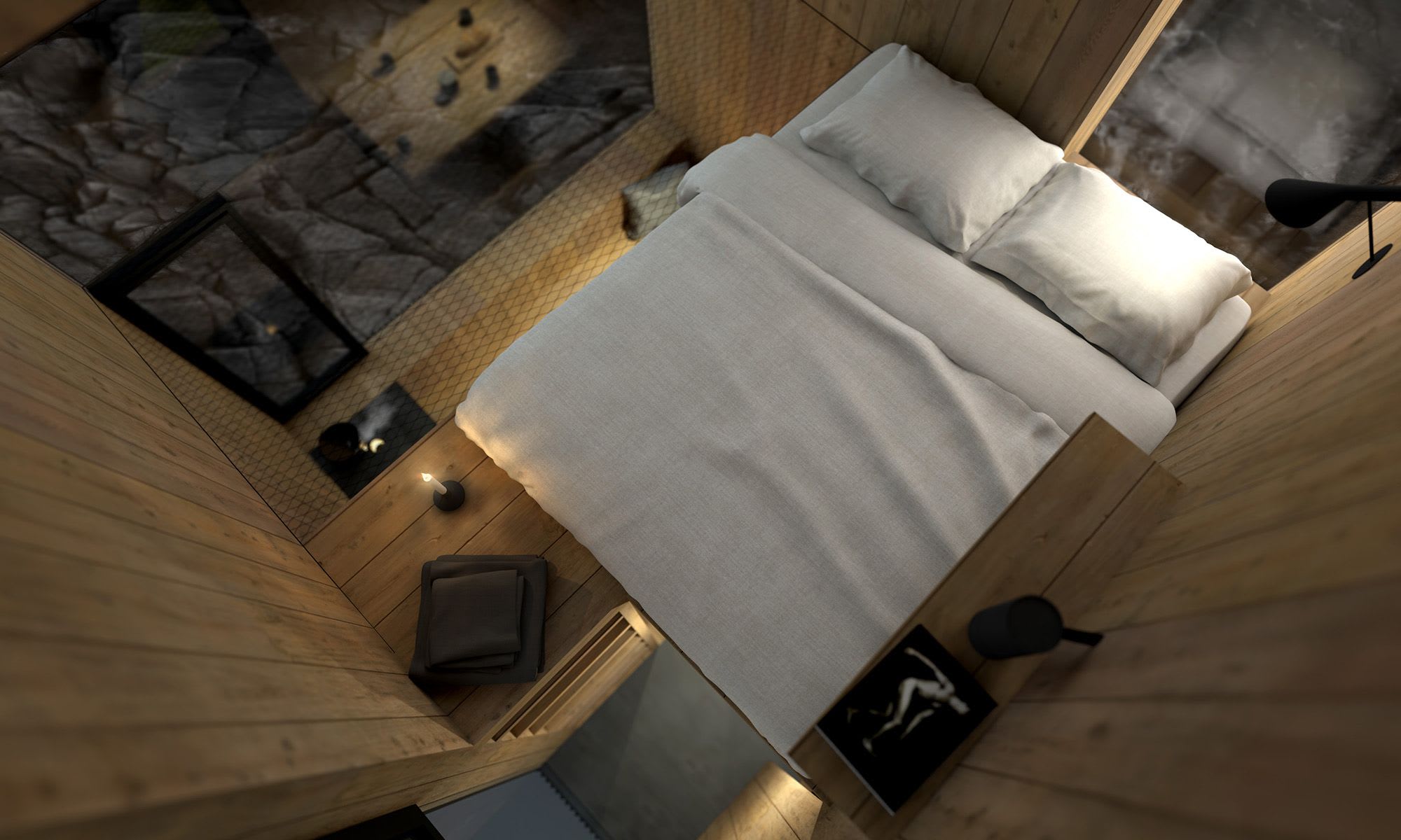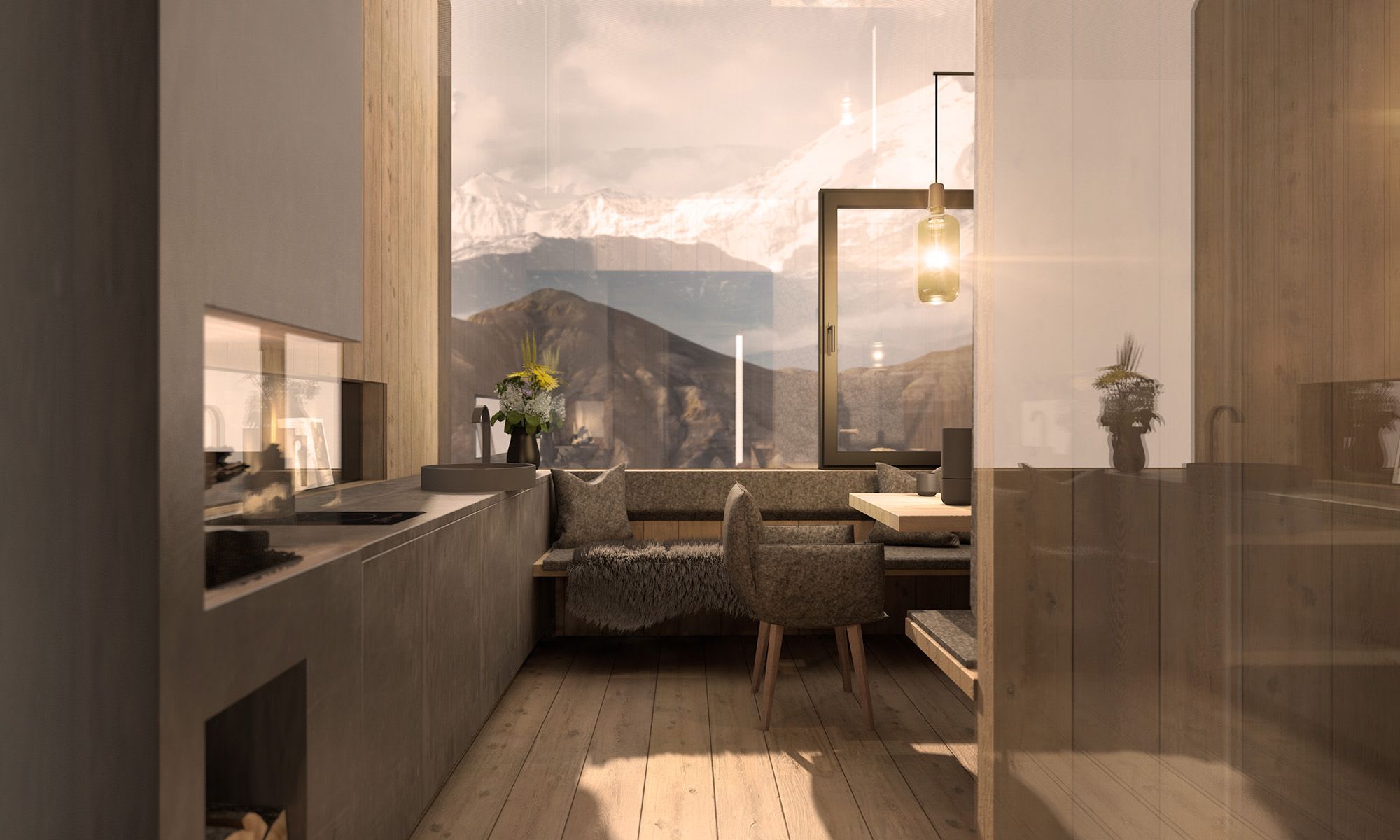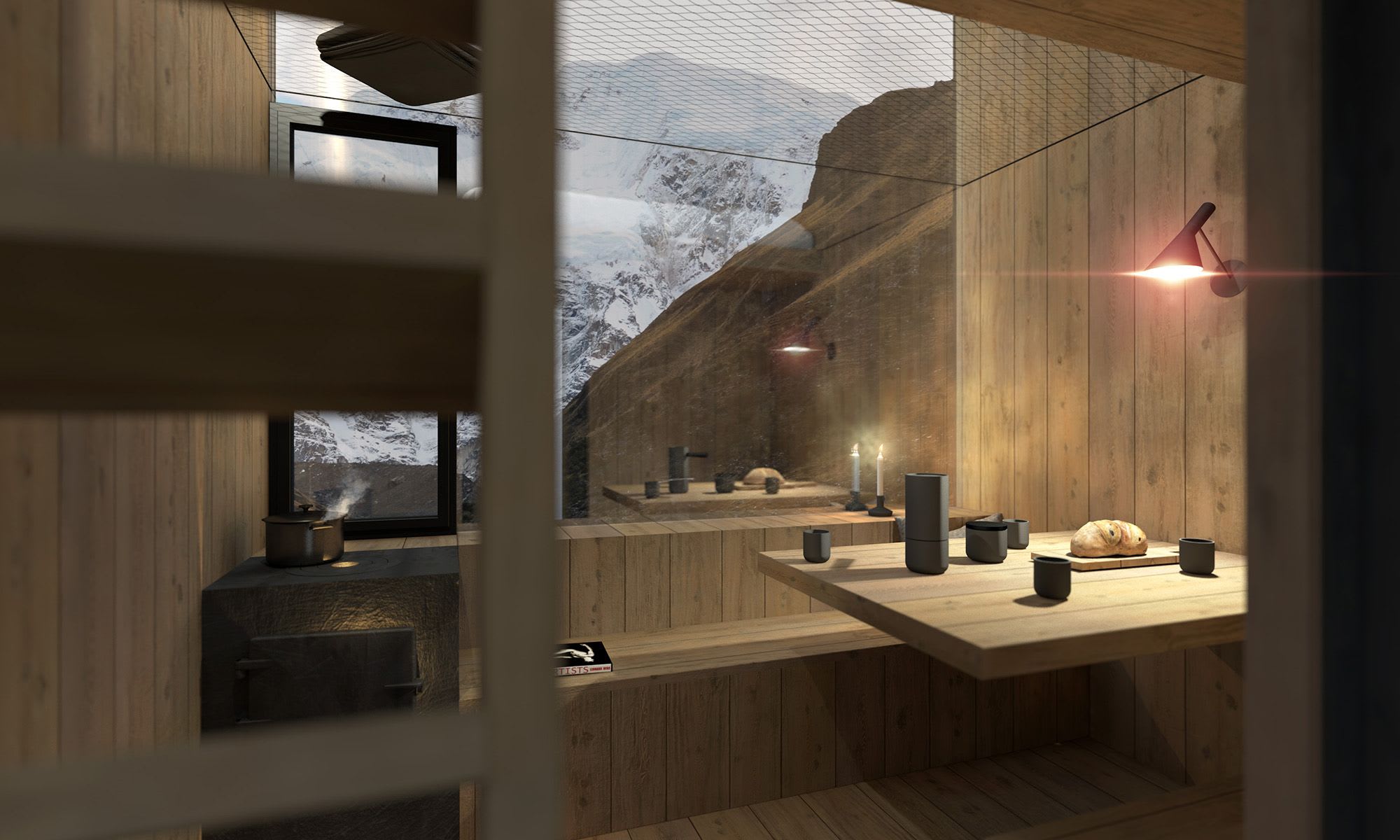 How can one reduce the area where they sleep, eat, and live to the essentials? By minimiz- ing the design to its fundamental elements and focusing on the existing materials. This is how our Ariane was created. A living object inspired by nature, the lifestyle of locals, their values, and traditions. To consciously and authentically experience life while feeling a sense of comfort and a thirst for adventure. The entire structure is made of larch wood and gives the impression of being carved from a single trunk. Inspired by the fascination of space travel, Ariane brings a completely new sense of living, almost like from another star. In sym- biosis with blooming alpine meadows, breathtaking mountain panoramas, or serene recre- ational landscapes, this unique composition makes the spirit of the time disappear. In the design, only one thing mattered: focus. Focus on reduction, form, and materiality.